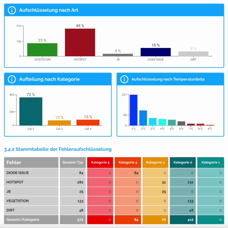 SkyVisor eignet sich insbesondere für große PV-Anlagen bzw. wenn viele kleine Anlagen effizient inspiziert werden müssen, da die Prüfberichte komplett automatisiert erstellt werden können. Nach dem automatischen Messflug werden die Daten in der SkyVisor Plattform hochgeladen und mittels KI-Software analysiert.