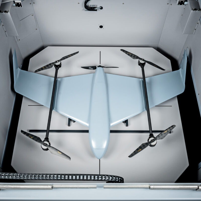 Herzstück des Droneports ist die Swift VTOL Drohne. VTOL steht für Senkrechtstart- und Landung, im Vorwärtsflug nutzt das System die aerodynamische Effizienz eines Flugzeugs. Die Drohne kann mit verschiedenen Nutzlasten ausgestattet werden, meist wird ein Sony Nutztlastsystem zur Erstellung von Orthofotos verwendet.